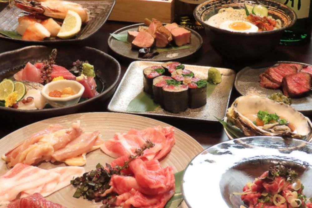 本鮪のとろたく巻き・いくらのせ・新鮮なお刺身盛り合わせ・金のポテサラ・海老としそのチーズスティックなど、種類豊富なお料理をご用意しています。